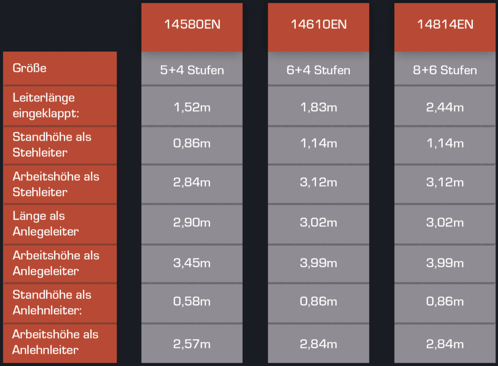 Sie können die Stufenstehleiter entweder in der A-Stellung, als kurze Anlegeleiter mit eingeklapptem Stützteil oder als lange Anlegeleiter mit 180° ausgeklapptem Stützteil verwenden. Der Vorteil für Sie, für sämtliche Arbeiten in der Höhe benötigen Sie nur eine einzige Leiter. Sie ist somit effektiv und Platzsparend.