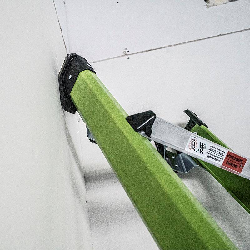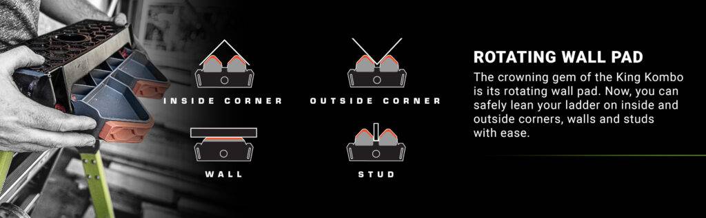 Dank der drehbaren Wand-Auflage können Sie die King Kombo sicher an Innen- und Außenecken, Wänden, Stangen und Pfosten anlehnen. Durch ihre einzigartige Bauart wird ein Wegrutschen der Leiter verhindert.