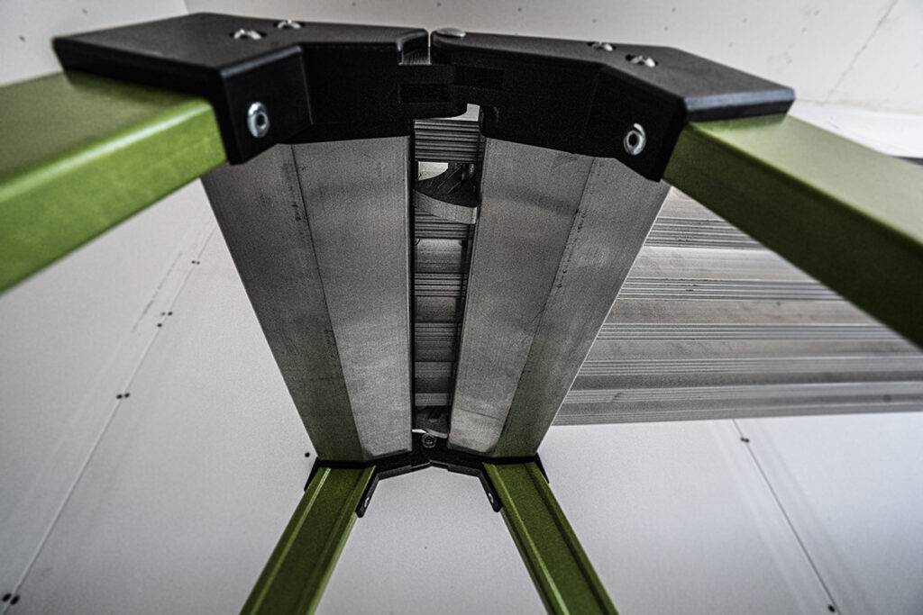 Die Teleskopbohle lässt sich mit ihren Haken, exakt im Zwischenraum der obersten Stufe der SureStep einhängen.