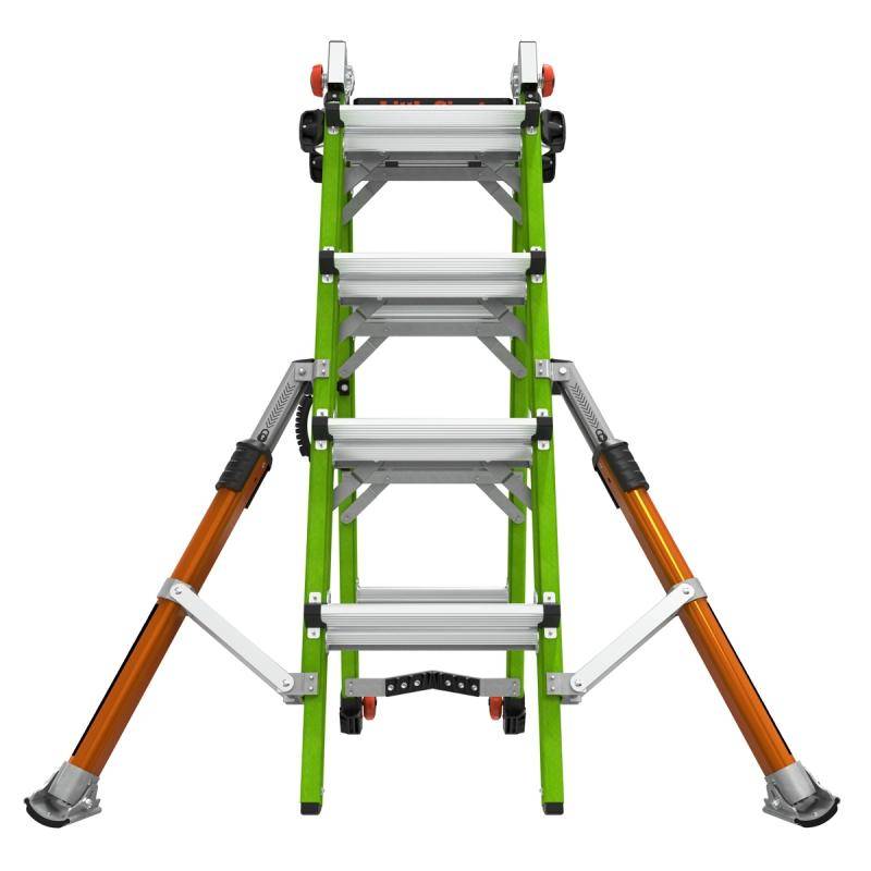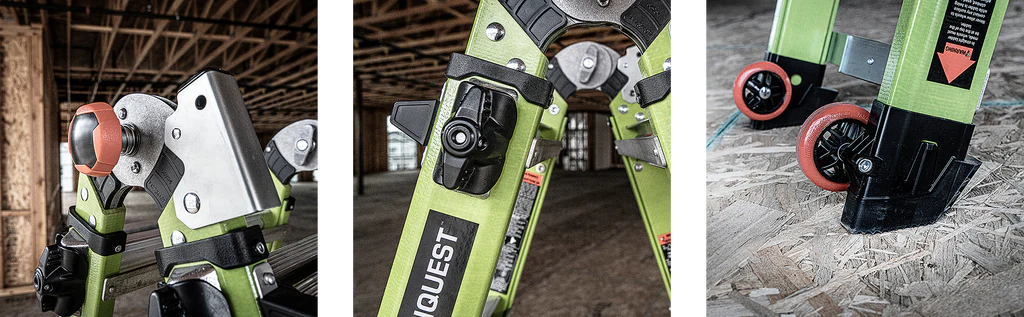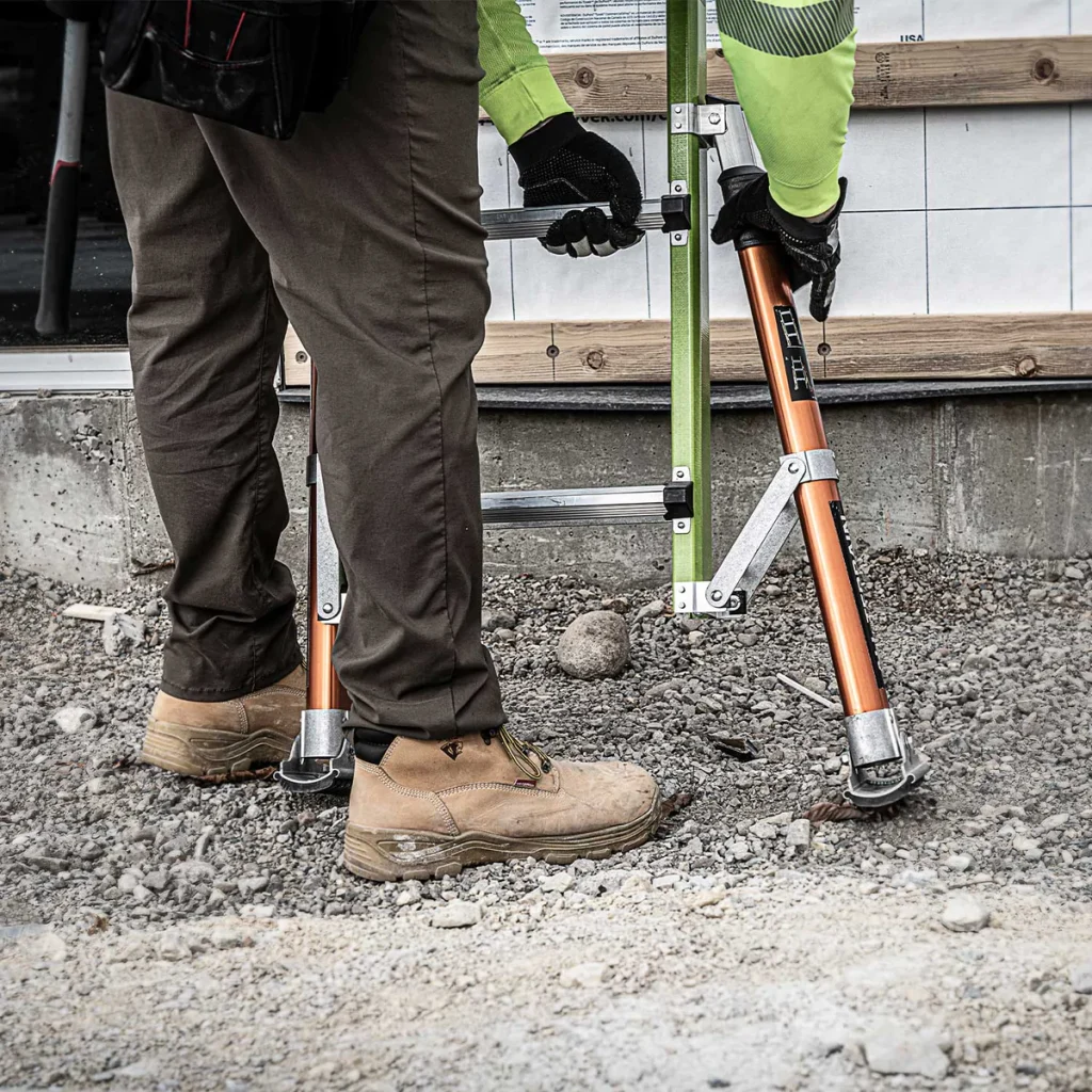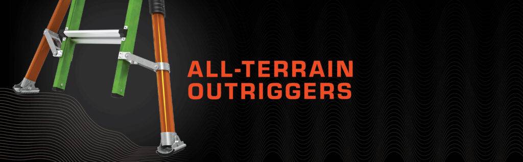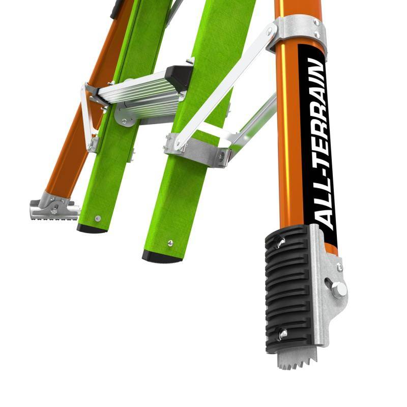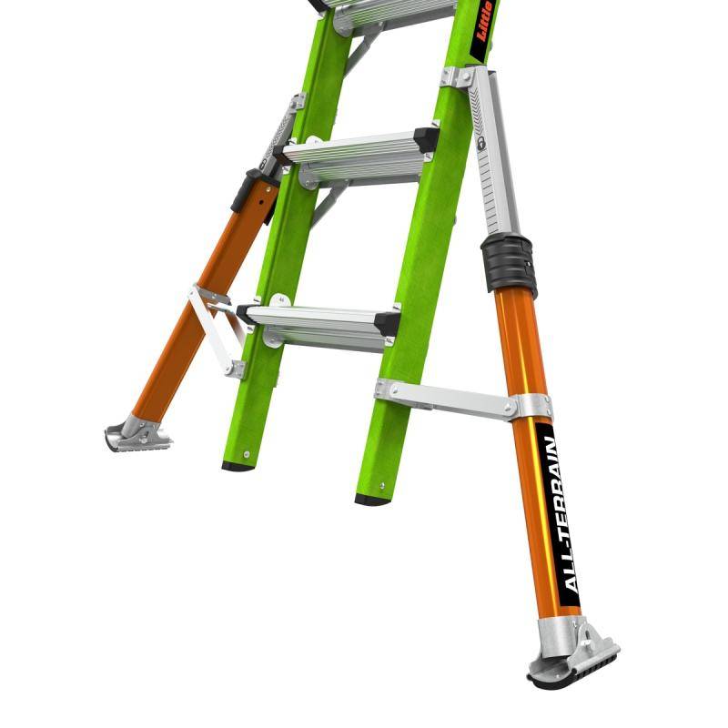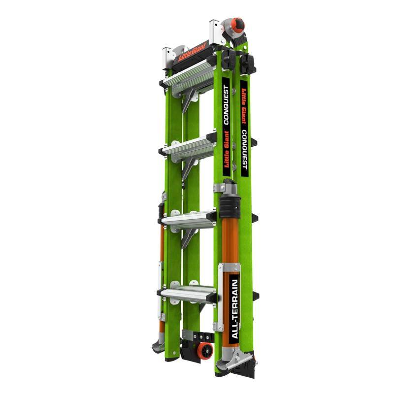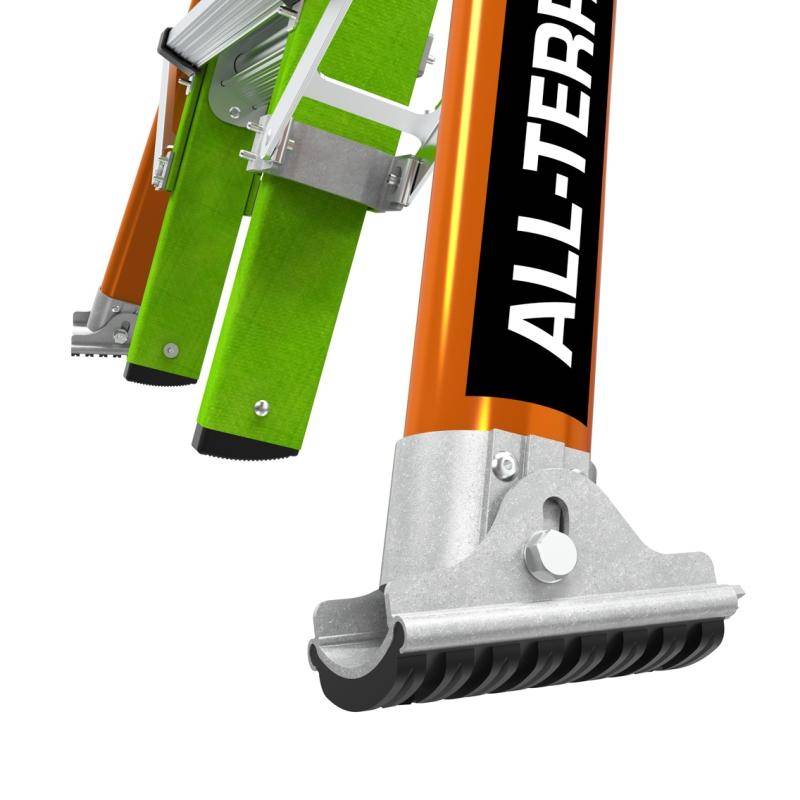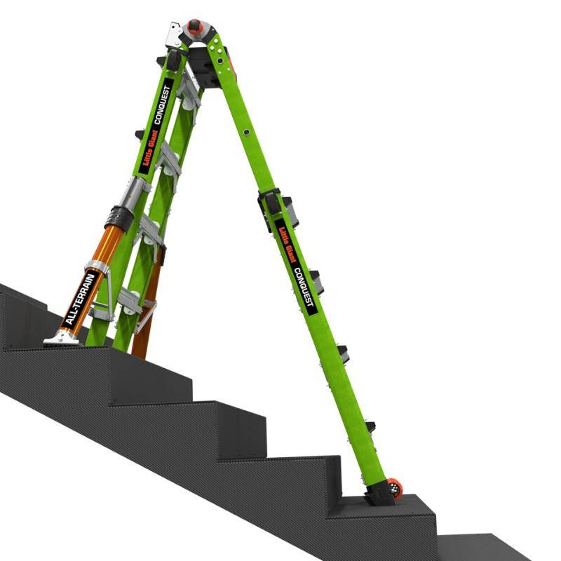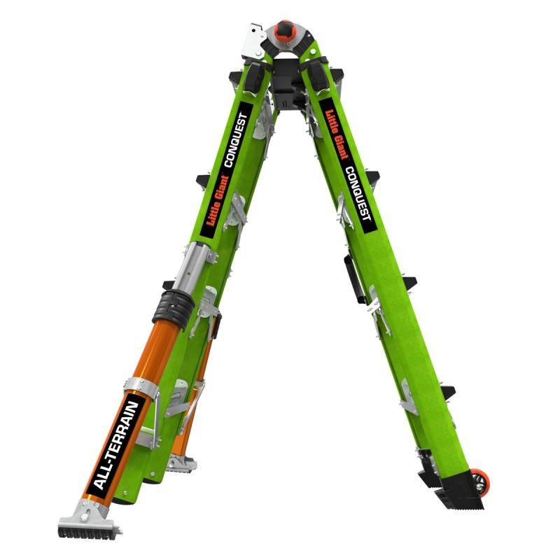 Die Teleskopleiter Little Giant® Conquest All-Terrain™ 2.0 ist mit seitlich montierten Auslegern, welche Bodenunebenheiten oder Treppenstufen ausgleichen können ausgestattet. Zusätzlich besitzen die Ausleger einen Drehfuß, welcher einen integrierten Erdspieß besitzt.