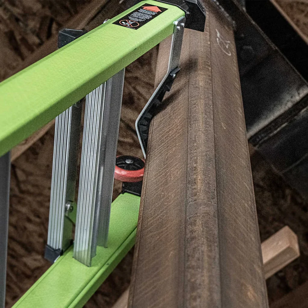 Die Anlegeseite der Teleskopleiter Conquest 2.0 ist schmal genug, um enge Räume zwischen Wandpfosten, Deckenbindern und Dach- oder Dachbodenöffnungen zu erreichen. Dank der V-Bar lässt sich die Leiter ebenso an Stangen oder Außenecken sicher anlegen. Die Gummifüße sind mit extra Wandanlegepunkten versehen und speziell für den Einsatz an Innenecken, sowie flachen Wänden konzipiert.