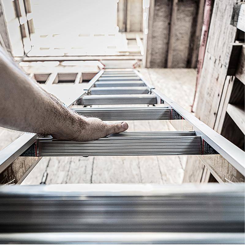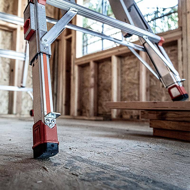 Die Leiter verfügt über patentierte Rapid-Locks und Palmbuttons, die eine schnelle Anpassung der Leiter ermöglichen. Die Holmverlängerungen können Stufenlos per Fuß ausgefahren werden. Dadurch können Sie die Leiter stabil auf unebenem Gelände aufstellen. Die Leveler ist somit flexibel und sicher in jeder Arbeitsumgebung.