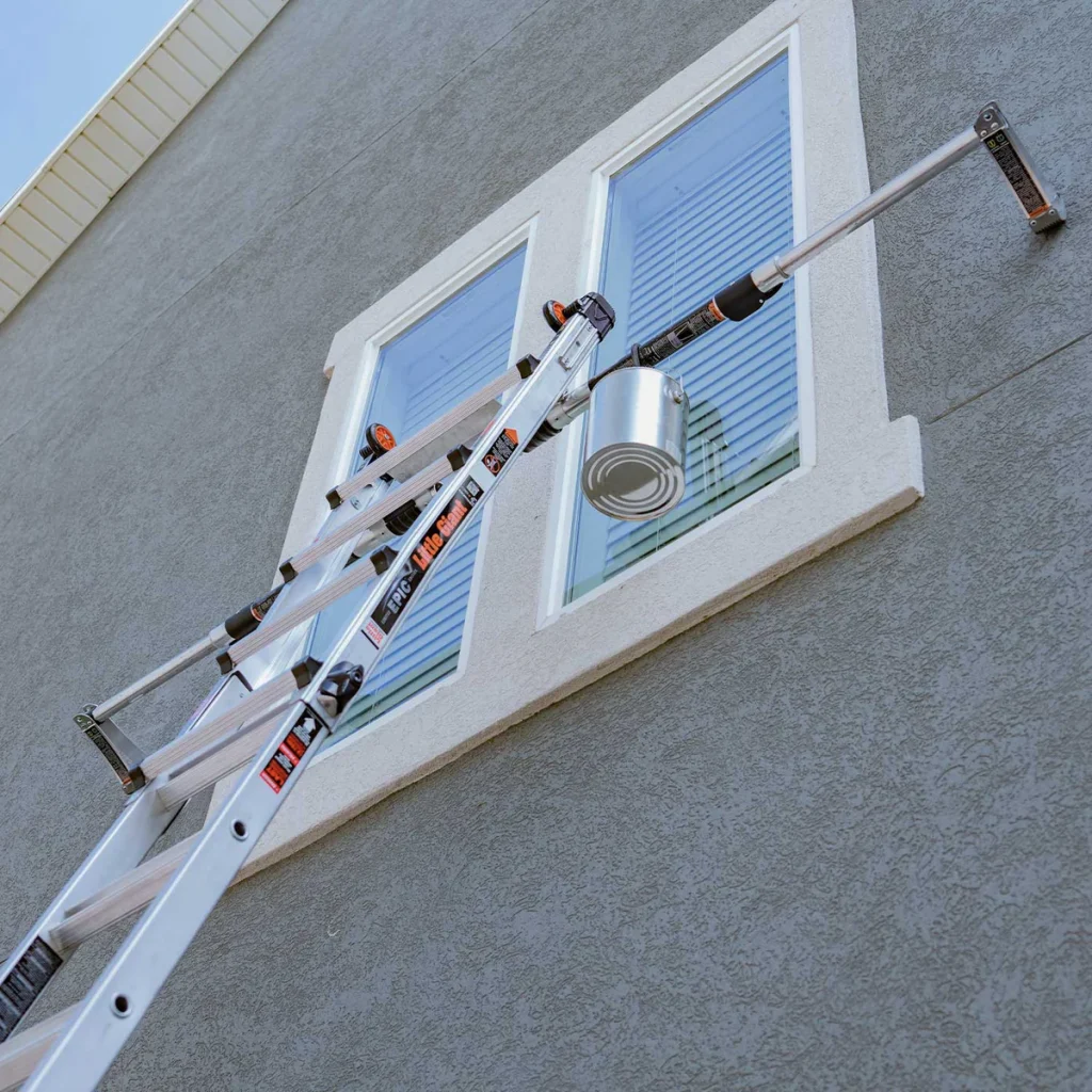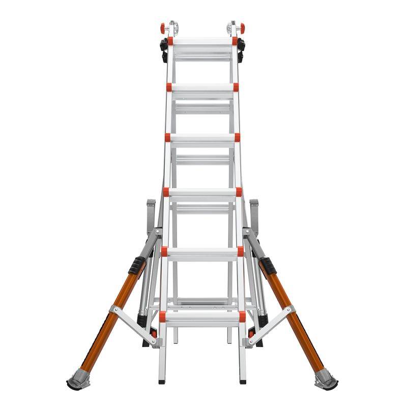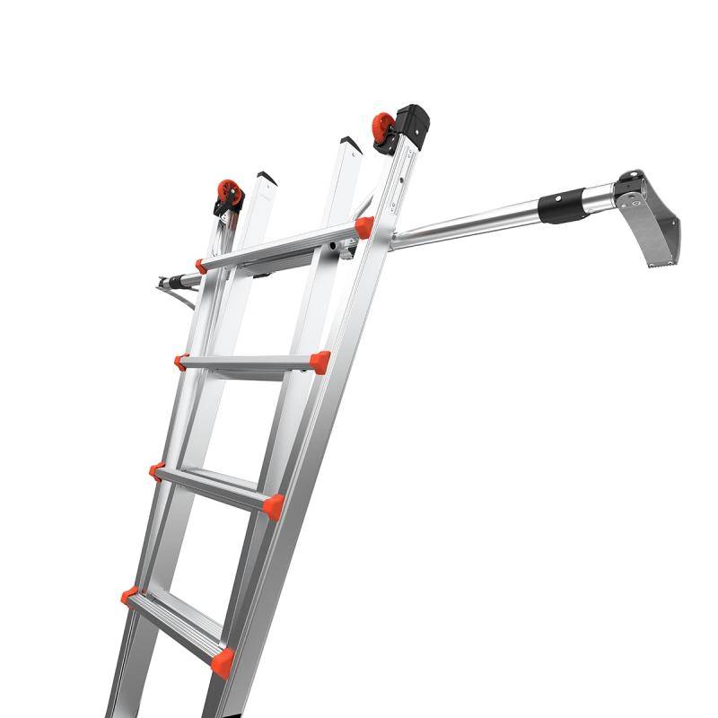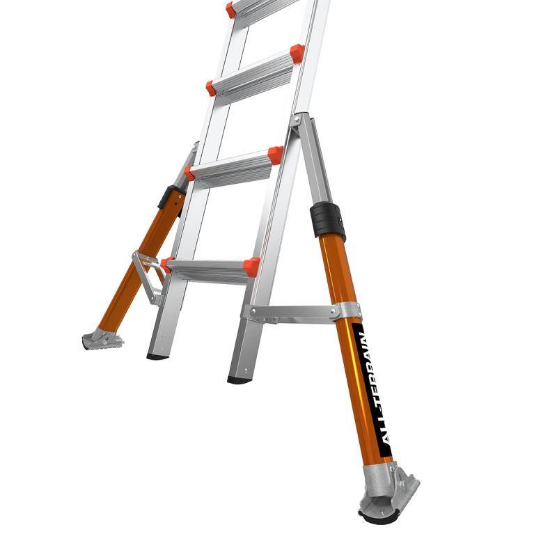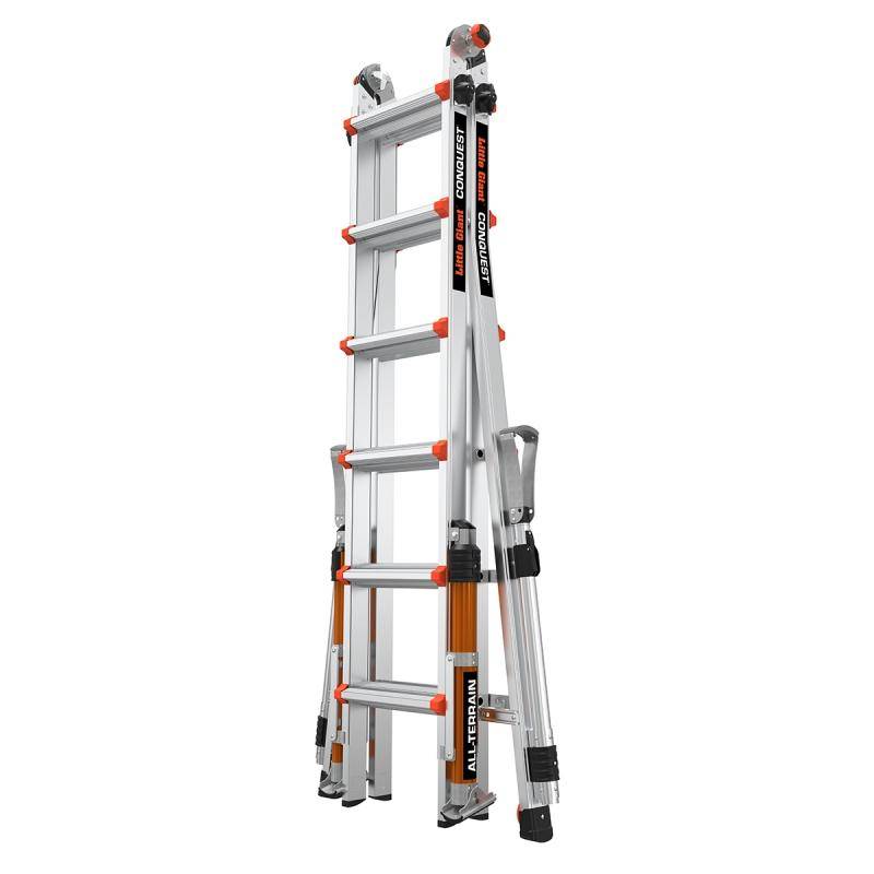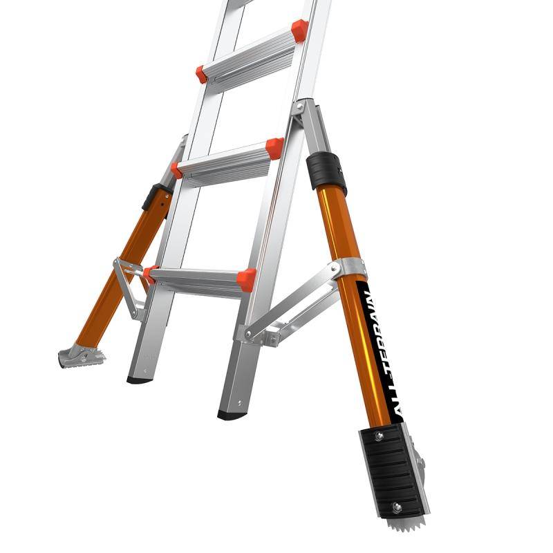 Die Teleskopleiter Little Giant® Conquest All-Terrain™ PRO ist mit seitlich montierten Auslegern, welche Bodenunebenheiten oder Treppenstufen ausgleichen können ausgestattet. Zusätzlich besitzen die Ausleger einen Drehfuß, welcher einen integrierten Erdspieß besitzt. Die Conquest Pro ist zudem mit SafetyRails ausgestattet, die beispielsweise als Durchgangsgeländer zum Betreten eines Dachs oder als Wandabstandshalter verwendet werden können.